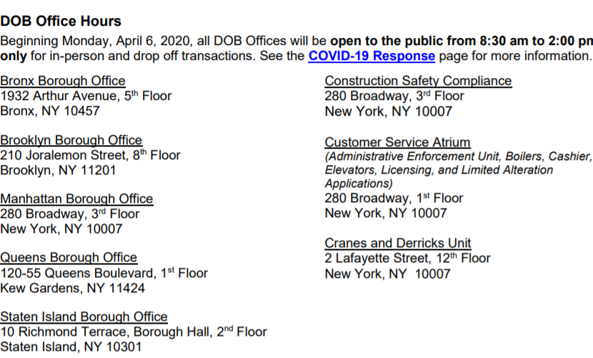 If you would like to file in-person the DOB has limited hours available. Please see below.